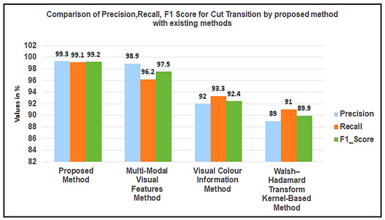 Table 6 depicts a quantitative comparison of the proposed method with the Multi-Modal Visual Features Method [23], the Visual Colour Information Method [40], and the Walsh–Hadamard Transform Kernel-based Method [27] in terms of precision, recall and F1 score. The approach applied in [23] performs cut and gradual transitions using multimodal features, with SURF features extracted for every frame, which greatly enhances algorithmic complexity whilst ignoring changes in illumination. Compared with [23], the proposed method has the highest average F1 score of 99.2% for cut and 92.1% for gradual transitions, respectively. The Visual Colour Information Method [40] records illumination changes perfectly, using the luminance component of the L*a b colour space. The method, however, lags in terms of tracking, and the features are affected by rotation and scaling, therefore showing decreased precision and recall for gradual transitions, when compared to the proposed method with average precision and recall measures of 91.7% and 92.6%, respectively. Figure 9 shows the average precision, recall and F-score graph for a performance analysis of the proposed algorithm with existing methods.