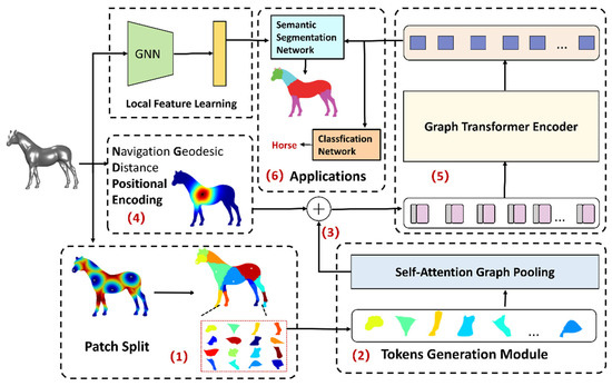 In this section, we introduce the components of our framework. The overall flowchart is shown in Figure 1. The framework consists of three modules: local feature learning, global representation learning, and application. The global-representation learning module has four parts: patch split, token generation, NGD-PE calculator, and graph transformer encoder. The aim was to change the basic architecture of the graph transformer as little as possible. Therefore, we mainly adapted the transformer and 3D shape in terms of input embedding and positional embedding—specifically, the input embedding format required for the transformer via the patch split and token generation module. The required positional-embedding format was generated by the NGD-PE calculator. Finally, the global association of the above features was determined through the graph transformer encoder. This method also adopted the idea of feature fusion, combining local feature learning with global representation learning to generate richer features.