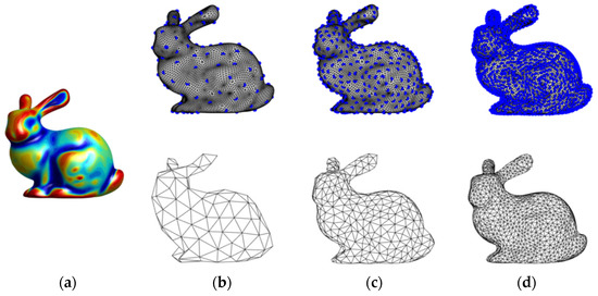 The Delaunay meshes corresponding to the initial seeds: (a) original model ( = 8002), shading with mean curvature; (b) = 128; (c) = 512; (d) = 2048. The blue vertices represent the sampling vertices; the shape of the second row in columns 2 to 4 is the Delaunay triangle meshes corresponding to the initial sampling points.