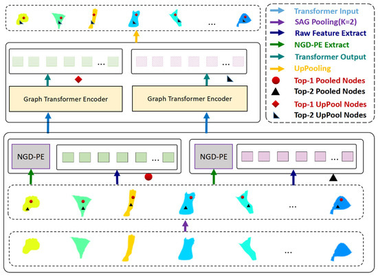 Patches can be treated as sub-meshes, but they differ in the number of the vertex. The proposed method selects the most representative nodes in each patch to satisfy the requirements of a unified input embedding shape format. In this method, only the K nodes from each patch are retained using the SAG pooling algorithm. For each patch, the feature of the selected vertices can be denoted as , and d is the dimension of raw feature embeddings. We further extracted the first top-j vertex in each patch and combined them to form a token sequence expressed as , where each row of represents a token embedding. Furthermore, we further created the K-individual matrices . Subsequently, K graph transformers are designed to learn these K embeddings. Following these few steps, it can directly return the features generated by transformers to the original mesh through pooling indices. Figure 3 shows the procedure for this part. In this process, the SAG pooling operation and the up-pooling operation are symmetrical in the feature space transformation. In other words, SAG pooling converts graph embeddings to token embeddings, while up-pooling, converts token embeddings to graph embeddings.