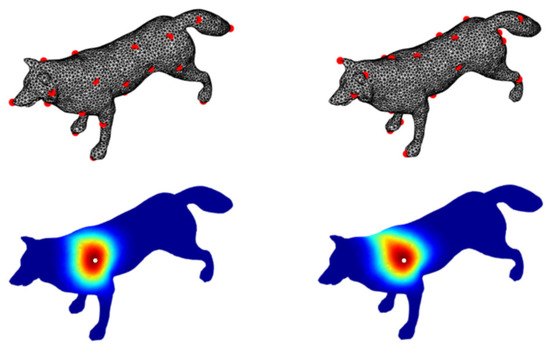 Clearly, satisfies the symmetry property, namely = , which guarantees the symmetry of the metric between two nodes. The NGD feature distance also indicates the geodesic proximity of two vertices on a surface. In general, the closer the geodesic distance between vertices, the larger the NGD-feature-distance value. The NGD-feature-distance distribution between a given vertex and the rest of the vertices appears outward-decaying and spatially isotropic and symmetrical (see Figure 4). The can control the decay rate of . Usually, the smaller the value of , the smaller the decay speed.