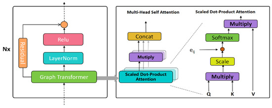 We adopted the graph transformer frameworks [15,17] for learning. Figure 5 shows the block diagram of our graph transformer encoder. Since contains the relative position information of the vertex i and j, it can also be taken as an edge feature. The input embeddings of the l-th token sequence are . The multi-head attention coefficients between token j and token i are computed as follows: