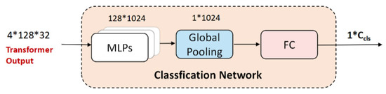 After passing through the transformer module, the embedding representation of the shape is . It was then reshaped as . Subsequently, the proposed method performed feature mapping through a set of MLPs and extracted global features through global pooling. Subsequently, the features were further transformed into the target category number via the fully connected network. The network block diagram is shown in Figure 6.
