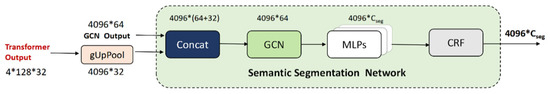 The output embeddings are firstly projected onto the global manifold structure through the up-pooling operation. Next, we combine the mapped features and the local features obtained from the GNN network to generate a new representation of each vertex following feature transformation through a set of MLPs. For the final results, we further post-process and optimize them using the conditional random field (CRF) [36]. The network block diagram is shown in Figure 7.