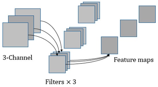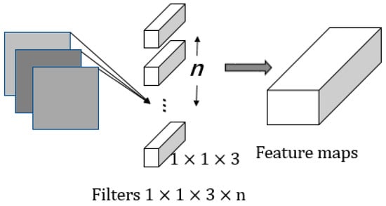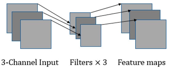The core layer of MobileNet V1 is a deep separable filter. Deep separable convolution is a form of deconvolution. The standard convolution operation is divided into two steps: (1) extracting feature maps, (2) superimposing the extracted feature maps. The depth separable convolution separates the course of two layers. Firstly, one layer is the depthwise convolution, which is employed to extract features for each channel. Lastly, the other layer is a point-by-point convolution, which employs a convolution to integrate the output of the first step. This decomposition is an uncomplicated and valid method that can significantly reduce superfluous calculations and optimize the network structure. Diagrams of standard convolution, depthwise convolution, and pointwise convolution are shown Figure 2, Figure 3 and Figure 4, respectively. The size of the input feature map is . Here, stands for the number of input channels, represents the size of the feature map, and denotes the number of output channels, and the parameters of a standard convolutional layer show , and indicates the size of the convolution kernel. If the size of the output feature map does not change, the computing costs of the standard convolution are