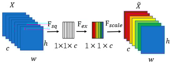 in which stands for the excitation function and is the input squeezed signal from the last layer. represents the ReLU activation function, is the channel using the kernel size and the dimensionality reduction ratio to scale down. is the channel with the ratio of r after being activated by ReLU. The final output of the block is rescaled using the channel shown below: