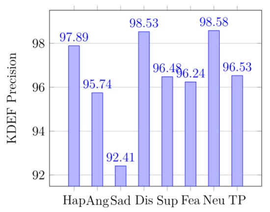 In comparison, we provide comparative results against 21 state-of-the-art algorithms, for example, HOG-TOP [15], SCNN [28], MCNN [28], SCNN-LBP [16], SCNN-gray [16], P-VGG16 [16], WMDC [16], WFTS [29], ACNN-LBP [17], Fusion(ACNN-LBP+GF) [17], STF+LSTM [18], DCNN-BC [31], IACNN [32], 2B(N+M) Softmax [33], CF+GT [34], Broad learning [35], Deep emotion [36], VGG19 [37]-1, and ResNet150 [37]-2, on two datasets. However, the contrast is limited to average recognition accuracy only. Some methods in Table 9 were executed on videos. Rare works premeditated a fewer number of classes. Table 9 shows the average classification accuracy obtained by the above mentioned 21 methods. It is obvious from Table 9 that our network conquers the twenty-one above models on CK+ and KDEF, and it occurs due to the use of a triple-structure network model. However, the above models are still contrasted according to training and testing time. The training time of a model usually relies on the size of the network, size of the input images, and so on. In the research, the above models were used in the light of their respective specifications. We used tenfold cross validation and 300 epochs when training our network on KDEF and CK+ datasets. The training and testing times required by the above 22 models, including our network on the two databases, are displayed in Table 9. However, testing time for onefold cross validation is noted only in Table 9. Testing time per image (TTPI) is the same for all the images of a database as their size is equal. IACNN takes about 700 min to train KDEF and about 633 min to train CK+, which is quite large. While the proposed method processes an image in 0.278 s, our method is still quite dominant in terms of accuracy.