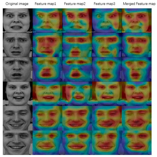 The first three rows of Figure 20 are angry, and the last three rows reflect happiness. The first three rows of Figure 21 are fear, and the last three rows correspond to happiness. The first three rows of Figure 22 are sad, and the last three rows reflect happiness. The second column of Figure 20, Figure 21 and Figure 22 shows that the global branch network can learn globally about images. In the third column, attention mechanism learning is stressed. In addition, the key learning area of the image is enhanced. The fourth column emphasizes the diverse intra-class, which shows that the learning is performed for multiple regions of the image. The fifth column combines the above advantages for more in-depth learning. The first three rows and the last three rows of Figure 20 are, respectively, angry and happiness, which belongs to an inter-class relationship. It can be observed from Figure 20 that the learning focus on the two types of expressions is different. The key learning area of the angry expression image is around the eyes. The learning area of the expression image is concentrated on the mouth for happiness. This discovery emphasizes the concentration of learning different areas of inter-classes. As for Figure 21, the focus on fear is the eyes and mouth, and the focus on happiness is around the mouth. As for Figure 22, the focus on sad is the eyebrows and mouth, and the focus on happiness is around the mouth.