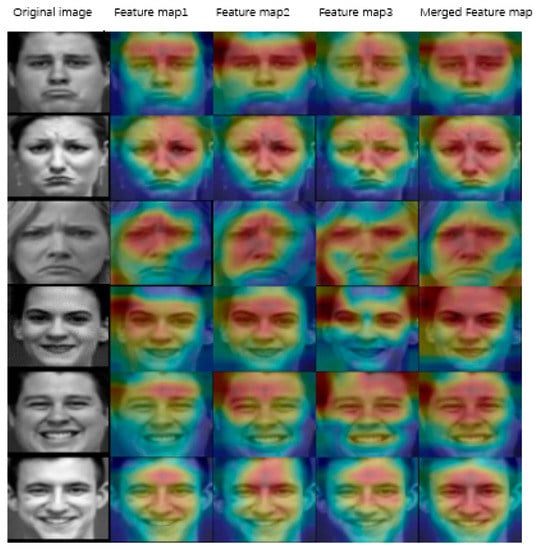 The expressions for the first three rows in Figure 20, Figure 21 and Figure 22 are, respectively, angry, fear, and sad. The three are similar in that they focus more on the area around the eyes. Meanwhile, the fear learning has an additional learning towards the area around the mouth and sad has an additional learning towards the area around the eyebrows. The expressions for the last three rows of Figure 20, Figure 21 and Figure 22 are happiness. This process is focused on the learning of intra-class features. In addition to the mouth, there is also learning around the eyes, which emphasizes the learning of the diversity of intra-class features.