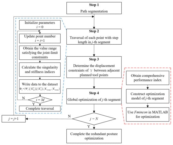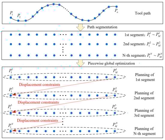 The global optimization strategy, which can comprehensively consider all the given tool points, is an effective method to avoid the problems caused by SSPOS. Nevertheless, the quantity of tool points is usually large, which leads to a high computational load for global optimization. Therefore, a piecewise global optimization strategy (PGOS) is proposed, and its flowchart is shown in Figure 3. Firstly, the segmentation is conducted for the given path on the principle of fixed length or fixed-point quantity. Then, globe optimization is employed in each segment until all tool points are optimized, which is introduced in detail in Section 3.2. In particular, the last tool point of the previous segment provides the displacement constraint of γ for the first point of the next segment.