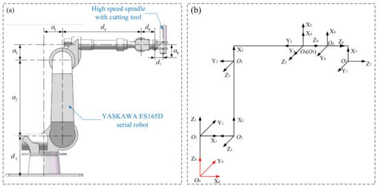 Figure 5. Robotic milling system. (a) YASKAWA ES165D serial robot with a high-speed spindle. (b) D-H model of robotic milling system.