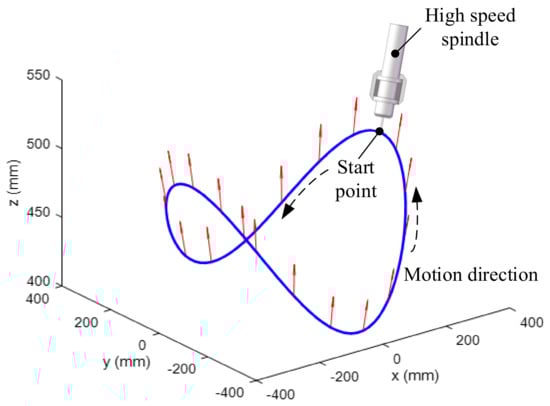 where θ [ 0 , 2 π ] , R   =   500 and r   =   300 are the radius of two cylindrical surfaces, respectively. The blue line containing 100 points is the target path of the tool center point (TCP). And the red arrow is the posture of the milling tool. Hence, the γ coordinate rotating around the red arrow is redundant and needs to be optimized.