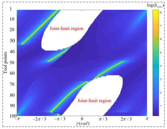 Based on the performance indices given in Section 2, the comprehensive performance of the robot in each tool point with different postures can be illustrated in Figure 8. The white areas indicate the region of joint-limit, where the corresponding γ cannot be chosen. In other areas, according to the color bar on the right, the darker the color, the better the comprehensive performance. Therefore, the redundant posture optimization is to obtain a continuous path in Figure 8, which can go through dark areas.