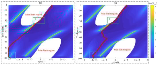 As shown in Figure 9a, the optimization results obtained by the traditional SSPOS method are illustrated by the red curve. As can be seen, due to the unreasonable joint-limit judge method, the middle points between the adjacent given tool points might not be able to satisfy the joint-limit constraint, such as the B area, especially when the given tool points have a long distance. Meanwhile, the SSPOS can easily to lead to the gradual deterioration of the optimization process. As can be seen from the A area, the γ optimization enters the bad area and cannot jump out because of the displacement constraint of γ between adjacent points. Therefore, the SSPOS has good performance for single-point optimization, such as robotic drilling, but is not suitable for robotic milling with a continuous path.
