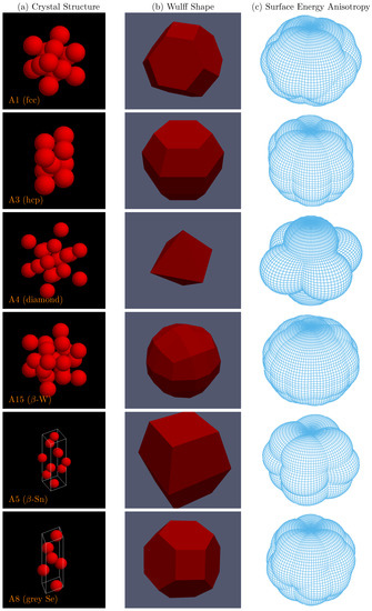- Nicholas, J. Calculation of surface energy as a function of orientation for cubic crystals. Aust. J. Phys. 1968, 21, 21–34. [Google Scholar] [CrossRef]