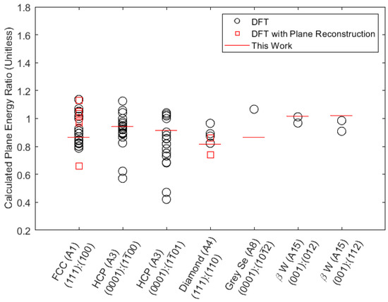 The surface energy results of this study are compared to those found in the literature in Figure 2. Plane surface energy ratios are used for comparison instead of absolute energies because the ratios are sufficient to determine the energy ranking of candidate surfaces and thus the Wulff shape. Within any given crystal and plane ratio entry, each point corresponds to results for a different chemical element. Red squares and black circles denote results from prior DFT surface energy calculations [5] obtained with and without surface reconstruction, respectively. We find that the surface energy ratios predicted by our method match well to those calculated using DFT methods. It is useful to note that the prediction error does not seem to be larger for data points that account for reconstruction effects.