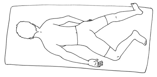 All MRI measurements were taken at the Multimodal and Functional Imaging Laboratory (MAFIL), CEITEC, Masaryk University, using a Siemens Magnetom Prisma 3T scanner. The first part of the MRI protocol was measured with a 64-channel head/neck coil and with subjects lying in the standard position (on their backs, face up). This part consisted of T1-weighted MPRAGE anatomical images covering the whole brain, with isotropic voxels of 1 × 1 × 1 mm. The second part was measured with an open Tx/Rx Cp head coil and with subjects lying in a prone position, face down. We measured: (A) a resting-state fMRI in the prone position with extended lower extremities for 6 min; (B) a resting-state fMRI in the prone position with semiflexion of the left lower extremity and with an extended right lower extremity and slight right hip abduction (see Figure 1) for 6 min. A prone position during the examination was selected due to the relaxation position of the trunk and lower extremities—the position is also part of crawling. The complete position of the upper extremities (shoulder elevation of the extended left extremity and semiflexion of the right one) was not possible during the MRI examination because of the gantry diameter. Both of these fMRI parts were acquired with the following parameters: 150 scans (volumes), repetition time (TR) 2.1 s, TE 35 ms, voxel size 3 × 3 × 4 mm (slice thickness of 4 mm), 30 slices in a transversal orientation. The first author (an experienced spine surgeon) was present during the MRI examination and checked the positioning of the participants.