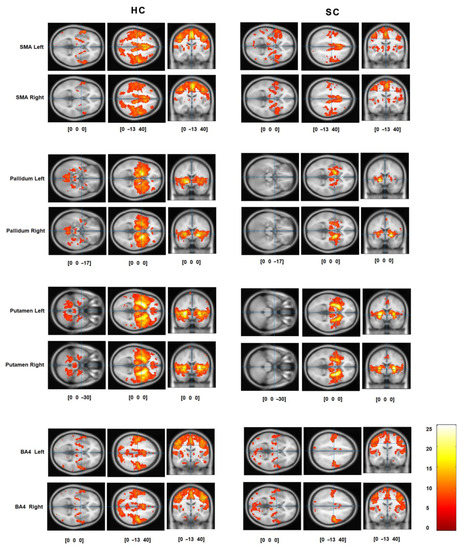 The basic pattern of FC, assessed with seed correlation analysis for both groups, lower extremities in an extended position, and all seeds, is presented in Figure 2. There is a lesser extent of voxels that are significantly correlated with seeds in the SC group than in the HC group. The locations with statistical significance are summarized in Table 1. It is clear that the connectivity maps look symmetrical for all seeds and both groups. Functional connectivity from the SMA and BA4 seeds revealed motor networks with sensory-motor regions. The pallidum and putamen seeds reveal connectivity in the basal ganglia.