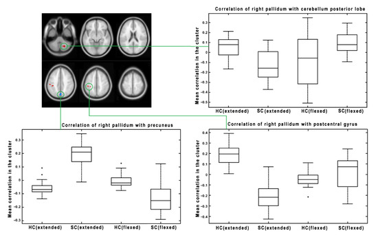 The results of interactions between groups and lower extremity position factors for the right pallidum as a seed region. The results were thresholded at a cluster level of p < 0.05 FWE corrected, with p < 0.001 uncorrected as the initial threshold to form clusters. The mean functional connectivity of the individual conditions (HC and SC with extended lower extremities, HC and SC with flexed lower extremities) is visualized as a box plot for each significant cluster. The boxplots visualize the median (line within the box); 25th and 75th percentiles (lower/upper box boundaries); data range without outliers (whiskers). Outliers are visualized as individual points.