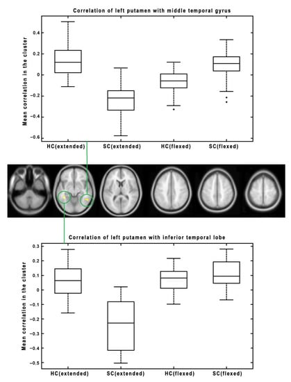 The results of interactions between the groups and lower extremity position factors for the left putamen as a seed region. The results were thresholded at a cluster level of p < 0.05 FWE corrected, with p < 0.001 uncorrected as the initial threshold to form clusters. The mean functional connectivity of individual conditions (HC and SC with extended lower extremities, HC and SC with flexed lower extremities) is visualized as a box plot for each significant cluster. The boxplots visualize: the median (line within the box); 25th and 75th percentiles (lower/upper box boundaries); data range without outliers (whiskers). Outliers are visualized as individual points.
