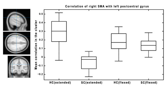 The results of interactions between groups and lower extremity position factors for the right SMA as a seed region. The results were thresholded at a cluster level of p < 0.05 FWE corrected, with p < 0.001 uncorrected as the initial threshold to form clusters. The mean functional connectivity of individual conditions (HC and SC with extended lower extremities, HC and SC with flexed lower extremities) is visualized as a box plot for each significant cluster. The boxplots visualize: the median (line within the box); 25th and 75th percentiles (lower/upper box boundaries); data range without outliers (whiskers). Outliers are visualized as individual points.