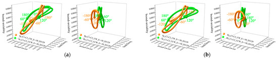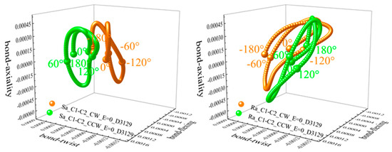 The stress tensor trajectory Tσ(s) of the torsional C1-C2 BCP for the CW (−90.0° ≤ θ ≤ 0.0°) and CCW (0.0° ≤ θ ≤ +90.0°) directions corresponding to the D3129 dihedral angle for the E field = 0. Left panel: the Sa stereoisomer; Right panel: the Ra stereoisomer. The degree markers for the torsion θ are indicated at steps of 30.0°.