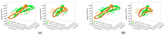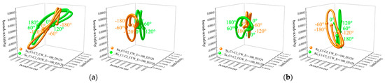 The background of QTAIM and next-generation QTAIM (NG-QTAIM), including the procedure used to generate the stress tensor trajectories Tσ(s), is provided in the Supplementary Materials S1. The ellipticity, ε, quantifies the relative accumulation of the electronic charge density ρ(rb) distribution in the two directions perpendicular to the bond path at a bond critical point (BCP) with position rb. For values of the ellipticity ε > 0 and where the ellipticity ε ≠ 0, the shortest and longest axes of the elliptical distribution of ρ(rb) are associated with the λ1 and λ2 eigenvalues, respectively, and the ellipticity is defined as ε = λ1/λ2 − 1. Note that λ1 and λ2 both possess negative signs, where λ1 ≤ λ2 < λ3 and λ3 > 0.