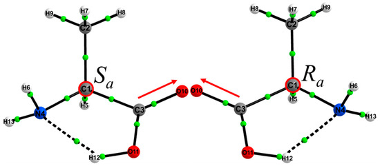 Molecular graphs of the Sa stereoisomer (left panel) and Ra stereoisomer (right panel) of alanine. The green spheres indicate the bond critical points (BCPs). The red arrows indicate the directions of the positive (+E) field along the C3→O10 BCP bond path and negative (-E) field along the C3←O10 BCP bond path. The C3, N4, and H5 atoms are bonded to the C1 atom; the H6, H7, and H8 atoms are bonded to the C2 atom. Numbered atoms in black define the dihedral angles {(3127, 3128, 3129), (4127, 4128, 4129), and (5127, 5128, 5129)} used in the construction of the spanning stress tensor trajectory Tσ(s); see the Computational Details section.