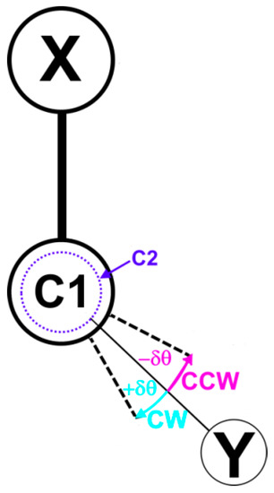 Definition of clockwise (CW) and counter-clockwise (CCW) directions of torsion using the conventional geometric dihedral angle θ defined by the sequence of atoms X = {C3, N4, H5}, C1, C2, Y = {H7, H8, H9}, sequentially further away from the viewing plane perpendicular to the C1-C2 direction, with atom X closest to the viewer and in the “12 o’clock” position. A negative step (−δθ) in the dihedral angle θ corresponds to C2—Y rotating in a CCW direction in the viewing plane; conversely, a positive step (+δθ) in the dihedral angle θ corresponds to C2—Y rotating in a CW direction in the viewing plane.