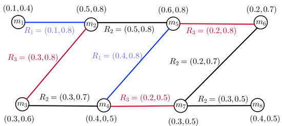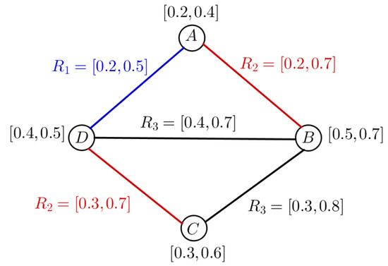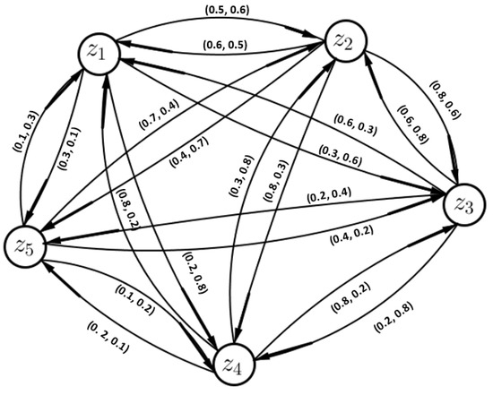Consider a GS , where , , and . Suppose Q, , , and is a vague fuzzy subset of W, , , and , respectively, then, is a VFGS on as shown in Figure 2, such that