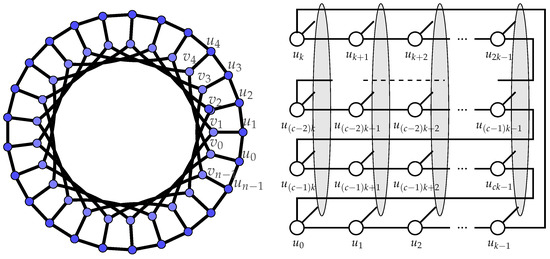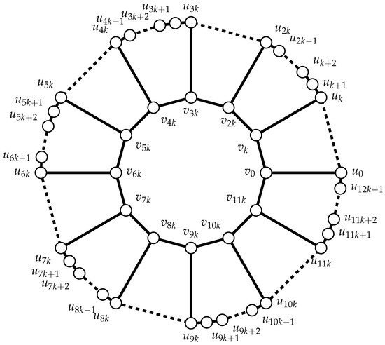Consider Figure 5, and observe that there are exactly c paths on the outer cycle between vertices of . All these paths have length . One-half of them, together with other vertices of , form disjointed cycles of length . Denote the union of cycles (as emphasized on Figure 5) by (the index zero is chosen because ).