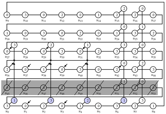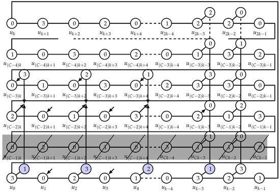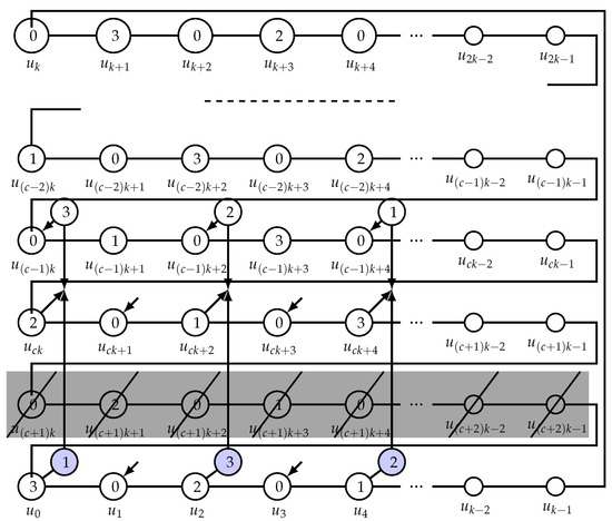 Now, let c be odd. Recall the construction in the proof of Proposition 6. The analogous argument in this case shows that . See Figure 3 for the case .