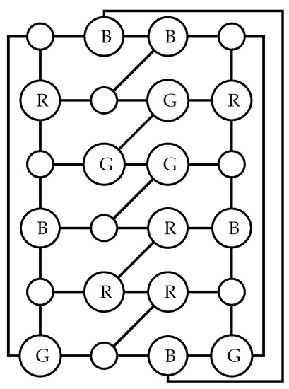 The idea is the following. Color one of the inner cycles (use the pattern 0-R-0-B-0-G). This coloring forces the colors of one-fourth of the vertices on the outer cycle. However, one-fourth of the vertices on the outer cycle already have one colored neighbor. Color the other half of the vertices on the outer cycle so that the second fourth is properly colored. Complete the coloring by assigning colors to one-half of the vertices on the second inner cycle. We omit the details. See example of Figure 6. □