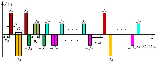 where x is the horizontal coordinate of each coil side. (i = A, B, C) is the ith phase current density function of the Qth (Q = 13, 14,…, 24) virtual slot coil side of the segment II.