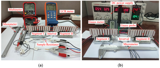 Figure 4b shows the experimental platform on the armature reaction field of the TSP ironless PMLSM. Three DC power supplies (UTP3313TFL-II and MS-305D) are used to provide currents for three-phase windings. The three-phase currents at different times are obtained by adjusting the magnitudes of the three DC currents. The values of three-phase currents are the same as the FEM current settings. The model of the Gauss meter is SJ700 and its resolution is 0.01 mT, which can meet the measurement for precision. As shown in Figure 1, region II and region III have the same air-gap flux density. Therefore, we employ the Gauss meter to record the lower air-gap flux density in region II. Besides, the flux density between the TSP region is also measured. The position of the flux density is defined by the micrometer and the interval distance between the TSP is adjusted by the micrometer.