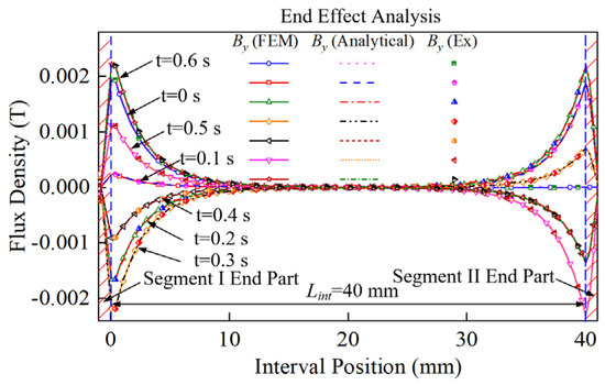 When the interval distance between the TSP is large enough, there is no coupling effect between the TSP. The interval distance is set to 4τ (40 mm) in this subsection. Since the three-phase currents vary periodically, it is necessary to compare the flux density of the experiment, FEM, and analytical modeling within a half electrical period. The half electrical period is divided into two time intervals (t = 0 s, 0.15 s, and 0.3 s). The middle position of the lower air-gap region II (y = 5.8 mm) is selected to verify the validity of the proposed analytical model. Figure 5 shows that the air-gap flux density distribution of the middle position of the lower air-gap region at three different times. It can be found that analytical results agree well with FEM and experiment results. Meanwhile, segment I and segment II have the same air-gap flux density distribution in the x and y direction. This also verifies that the 40 mm interval distance is large enough without occurring the coupling effect. As seen, the armature reaction field is relatively small due to lacking the iron core primary. Therefore, it requires higher accuracy of the analytical model.