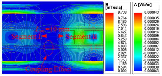 Firstly, the magnetic flux line distribution at the end of the TSP is obtained by FEM shown in Figure 7. The interval distance is 10 mm and the 2-D contour map displays at the 0.15 s moment. As seen, the magnetic flux line between the TSP ends affects each other. Meanwhile, the coupling effect within the interval distance Lint = 10 mm is investigated in this subsection.