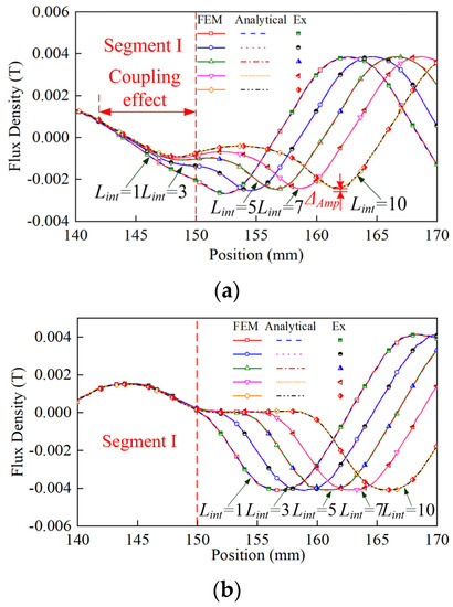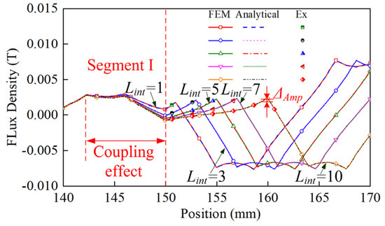 Figure 8a shows that the tangential air-gap flux density distribution curves differ with different interval distances in the middle position of the lower air-gap region II. When the interval distance is smaller, the amplitude of the tangential air-gap flux density varies more. The amplitude of the tangential air-gap flux density between Lint = 1 mm and Lint = 10 mm differs about 0.28 mT, and the rate of variation in magnitude is about 11.6%. Besides, the depth of the segment I tangential air-gap flux density affected by the coupling effect is about 5–10 mm. Owing to the coupling effect, the tangential air-gap flux density generated by the TSP becomes asymmetrical. However, as shown in Figure 8b, the normal air-gap flux density distribution curves are basically the same with different interval distances in the middle position of the lower air-gap region II. Variations of amplitudes in various interval distances are basically identical. The coupling effect has little influence on the normal air-gap flux density. The analytical results in region II match well with the FEM and test results.