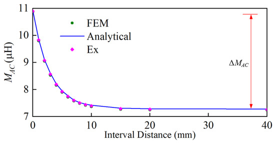 According to Equations (16)–(19), the coupling inductance can be calculated. The results of inductance without coupling effect obtained by the FEM, analytical, and experiment are presented in Table 2. The errors among them are relatively small. Further, according to the conclusions in Section 5.2, the coupling effect only affects the mutual inductance of MAC and has almost no effect on other inductances owing to the depth of the coupling effect. As seen in Figure 10 and Table 3, the end coupling inductance of MAC affected by coupling inductance decreases exponentially with the interval distance. The average value of MAC decreases from 10.90 μH to 7.26 μH, and the rate of change is about 50.13%. Influenced by the coil size in the motor, the end coupling inductance is relatively small. However, for the large power MSP ironless PMLSM, the coupling inductance can be larger.