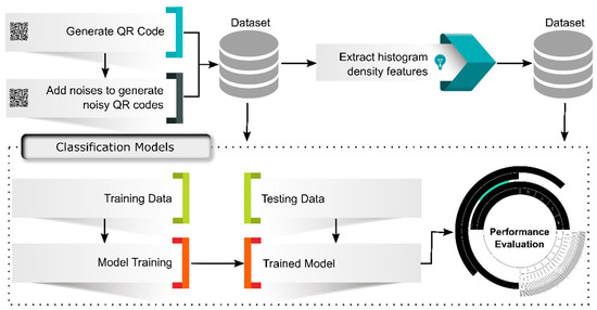As depicted in Figure 1, the paper proposed two different schemes for the classification of noisy QR images. In the first scheme, the generated dataset images (original QR code, and noisy QR code) are fed directly to various deep learning and machine learning-based classification models. The second scheme exploited the histogram density feature extraction technique to shape data into useful representation and then fed it to classification models. After successful training, the accuracy of all models in proposed schemes is computed using all data from the test dataset. Our model’s usefulness and performance are evaluated using four metrics: accuracy, precision, recall, and f1 score. Moreover, confusion matrices are also presented to analyze the false-positive and false-negative test data. The experimental study used cross entropy as a loss function, specifically the categorical type of cross entropy because a stable loss function will generalize the model well [28].
