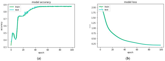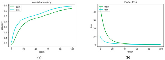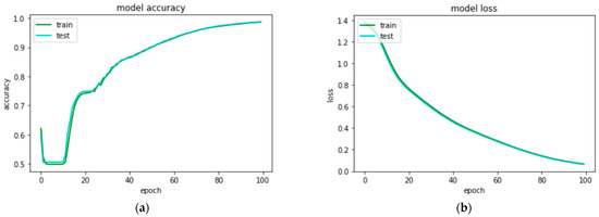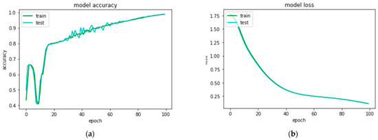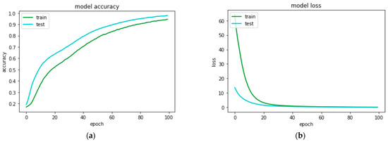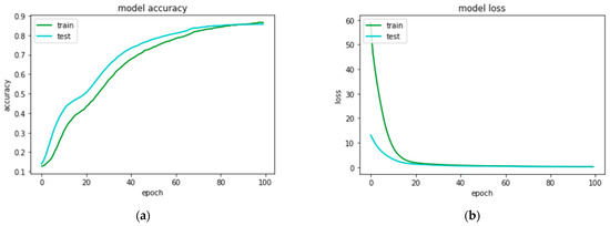 Performance curves of artificial neural network model when trained with features extraction through histogram density feature extraction technique to classify 8 types of quick response code images: (a) accuracy curves for train and test sets; (b) loss curves for train and test sets.