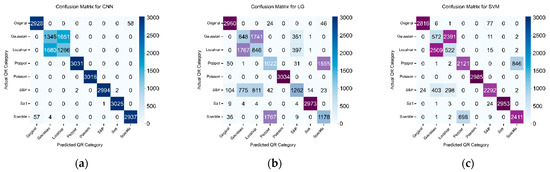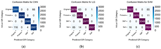 The confusion matrices for proposed classifiers when trained without external feature extraction technique to classify original quick response (QR) code and 3 different types of noisy QR code images. (a) convolutional neural network (CNN); (b) logistic regression (LG); and (c) support vector machine (SVM).
