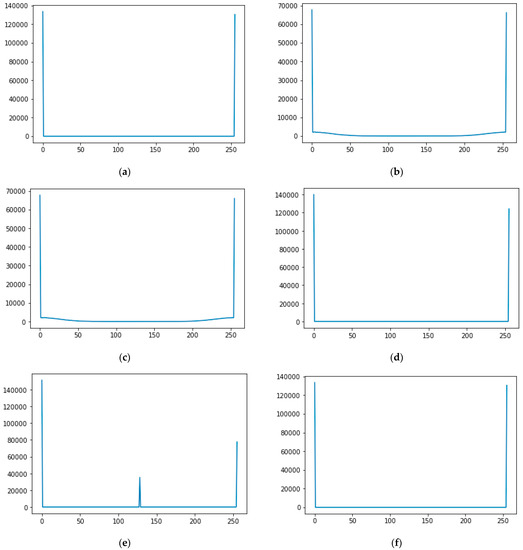This scheme involves a computer vision technique to extract useful features. It exploited the histogram density analysis technique to extract useful features from each dataset image. Figure 14 shows the histogram analysis for all kinds of QR code images in the dataset, where it extracted 256 features using histogram density feature extraction, which is then fed to machine learning-based classification models, including ANN, SVM, and LG. Contrary to Scheme 1, the dataset is no longer in the form of images; thus, ANN is exploited instead of CNN under this scheme, such as Scheme 1. We further widened the study by introducing three different scenarios of the dataset, where each scenario involves a combination of different types of noisy images with original QR images to train and test the classification model.
