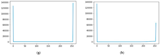 Histogram analysis of normal and noisy quick response (QR) code images where the x-axis represents the pixel number and the y-axis shows the value. (a) Normal QR codes; (b) Gaussian noisy QR codes; (c) Localvar noisy QR codes; (d) Pepper noisy QR codes; (e) Poisson; (f) Salt and pepper noisy QR codes; (g) Salt noisy QR codes and (h) Speckle noisy QR codes.