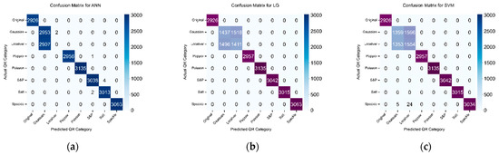 The confusion matrices for proposed classifiers when trained with features extraction through histogram density feature extraction technique to classify original quick response (QR) code and 7 different types of noisy QR code images. (a) artificial neural network (ANN); (b) logistic regression (LG); and (c) support vector machine (SVM).