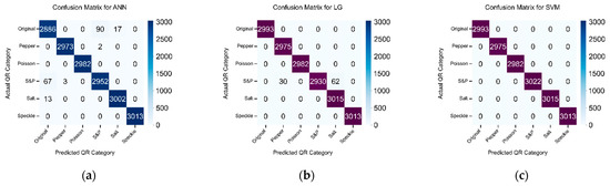 The confusion matrices for proposed classifiers when trained with features extraction through histogram density feature extraction technique to classify original quick response (QR) code and 5 different types of noisy QR code images. (a) artificial neural network (ANN); (b) logistic regression (LG); and (c) support vector machine (SVM).