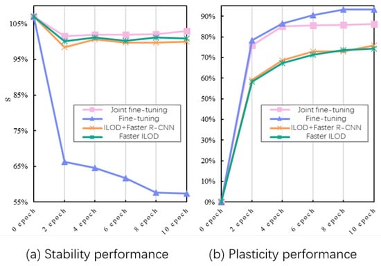 The existing approaches based on knowledge distillation fail to handle this situation. To be specific, the original learning experience of identifying unlabeled new classes as the background is also retained when implementing the knowledge distillation strategy, and this in turn hinders the effective learning of new class objects by the model. Figure 2 shows the changes of stability and plasticity of multiple class-incremental detection methods under the same object detection model on the DOTA [] dataset as the training iterations of incremental learning increases. This metric is calculated in Section 4.3 and the specific experimental setup is shown in Section 4.4. As can been seen from the figure, the class-incremental detection method ILOD [] based on knowledge distillation has a smaller gap in stability performance and joint fine-tuning and fine-tuning compared to Faster ILOD [], while the plasticity performance is poorer.