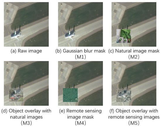 Five types of selective masks in the SDCID method are set, as shown in Figure 7, where natural images are from the VOC2007 dataset [] and remote sensing images are from the SIRI dataset [], which are first transformed to the target size when used as masks, and the pixels are overlaid with equal weights.