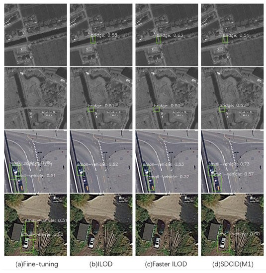 Further analyzing the AP50 accuracy results on each class of the DOTA dataset, according to the results in Table 2, the ILOD method had the maximum value on one class, the Faster ILOD method had the maximum value on three classes, the SDCID (M2) method had the maximum value on six classes, and the SDCID (M1) method had the maximum value on five classes.