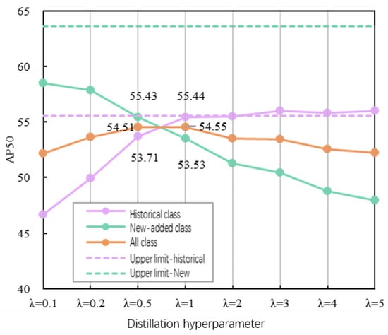 In the SDCID method, there is a distillation hyperparameter, , whose value is set to 1 by default in the performance comparison and efficiency analysis experiments. We analyzed the distillation hyperparameters by investigating the effect of different distillation hyperparameters on the performance of the SDCID method. The values of distillation hyperparameters were set to seven values in addition to the default value. A distillation hyperparameter value greater than 1 indicates that the overall loss function guides the original detection model to focus more on knowledge distillation to maintain the knowledge on the object of historical classes and reduce the learning effort on the data of new classes. When the distillation hyperparameter value is less than 1, the overall loss function has less weight to maintain the knowledge on objects of historical classes according to the knowledge selective distillation strategy, and the parameters related to the distribution of new class data are continuously updated by fine-tuning.